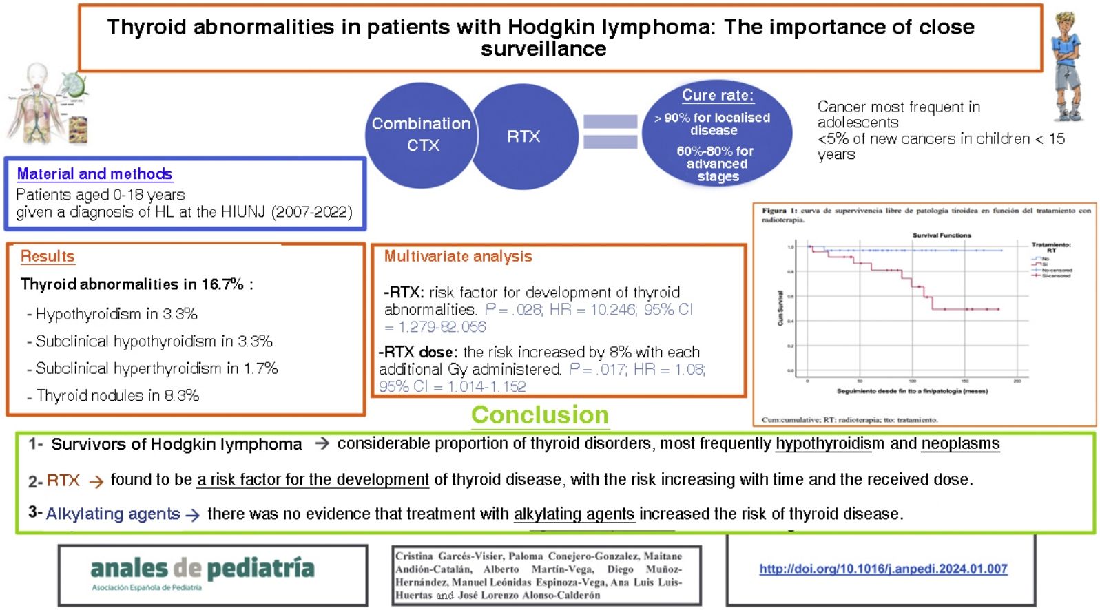 Material and methodsWe conducted a retrospective observational study including patients aged 0–18 years given a diagnosis of HL in our hospital (a reference centre for paediatric oncology) between 2007 and 2022 through the review of the electronic health records (HCIS database). We used Microsoft Excel® to collect data on demographic (age, sex), clinical, radiological and histological characteristics, the doses of RTX (expressed in Gy) and alkylating agents (cyclophosphamide equivalent dose [CED], calculated with the formula published by Green et al.)4 and the detected thyroid abnormalities. These data were analysed with the statistical package SPSS version 17, using the Fisher exact test and the linear-by-linear χ2 test for the analysis of qualitative data and nonparametric tests for quantitative data, in addition to generating Kaplan-Meier curves.