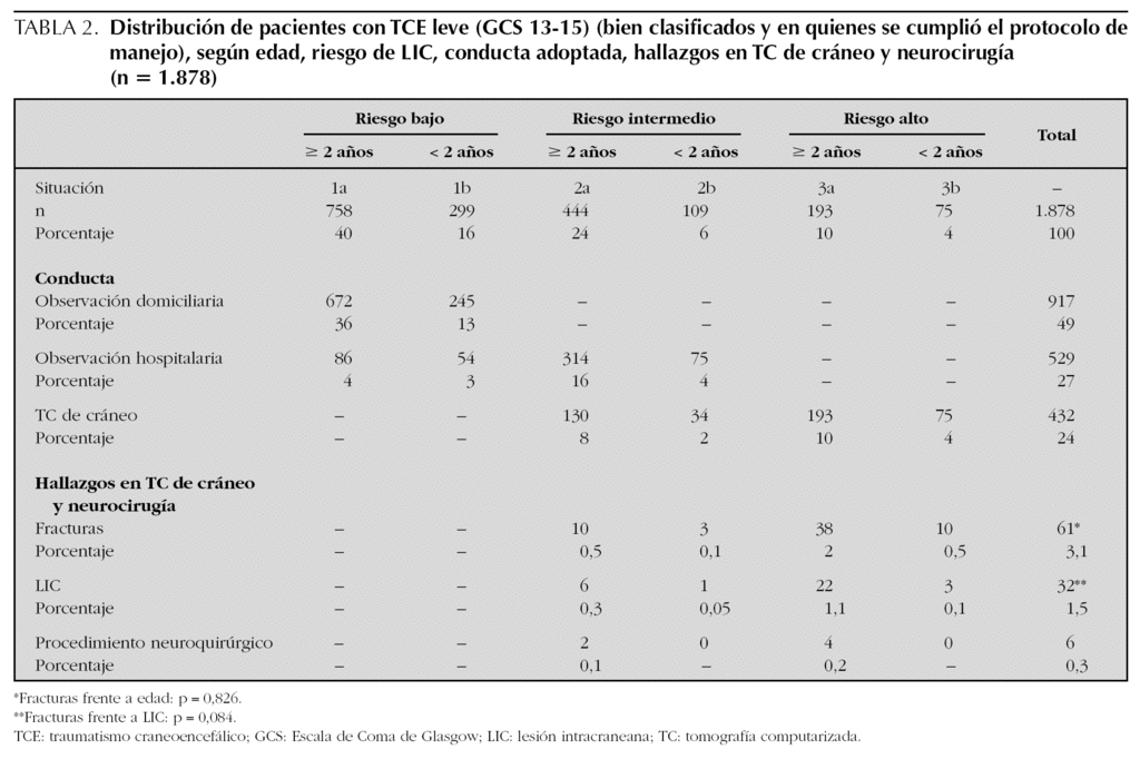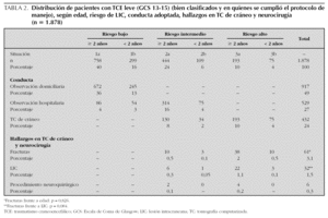 TABLA 2. Distribución de pacientes con TCE leve (GCS 13-15) (bien clasificados y en quienes se cumplió el protocolo de manejo), según edad, riesgo de LIC, conducta adoptada, hallazgos en TC de cráneo y neurocirugía (n 5 1.878)