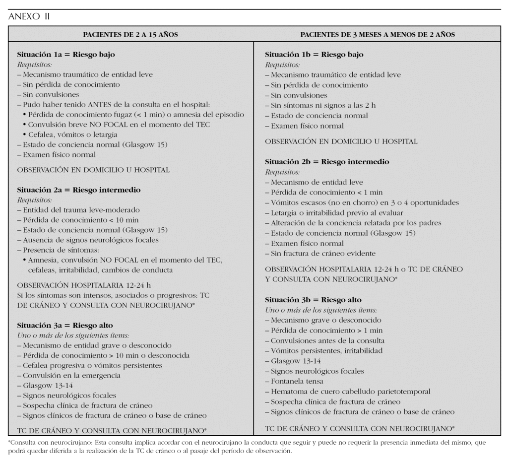 Los niños con examen neurológico y TC normales pueden ser dados de alta sin riesgos cuando se asegure una observación fiable en el hogar 2. No obstante, no sería posible en la práctica ni económicamente viable realizar TC a todos los niños con TCE leve. El problema prioritario radica en detectar cuáles son los pacientes que pueden continuar en vigilancia domiciliaria, cuáles son aquellos que requieren observación hospitalaria y cuales son los que requieren estudios de imágenes.