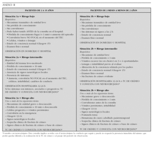 Se registró la presencia o ausencia de signos y síntomas vinculados al TCE antes y durante la consulta, lo que condicionó la distribución de los pacientes en seis diferentes situaciones de acuerdo a la edad y al riesgo de presentar LIC. La descripción de cada situación, y las conductas recomendadas, se recogen en el anexo II.