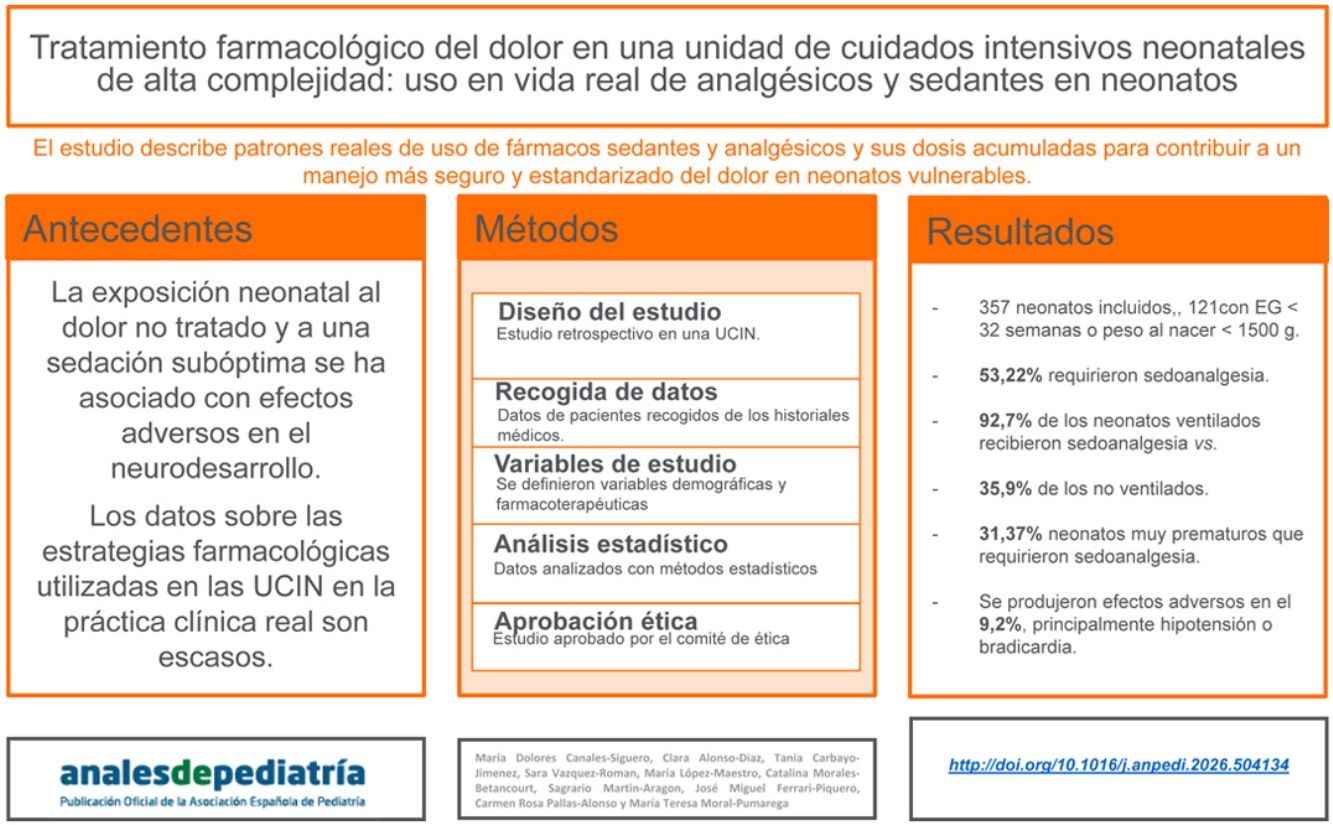 El manejo eficaz del dolor en neonatos sigue siendo un desafío importante, con datos limitados sobre las estrategias farmacológicas utilizadas en unidades de cuidados intensivos neonatales (UCIN) en la práctica clínica real. La exposición neonatal al dolor no tratado y a una sedación subóptima se ha asociado con efectos adversos en el neurodesarrollo. El objetivo de este estudio fue describir los patrones reales de uso de fármacos sedantes y analgésicos en una UCIN de alta complejidad.