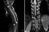 Resonancia magnética de la columna vertebral que revela una malformación arteriovenosa intramedular a nivel de D10 (flecha), caracterizada por ectasia y hematomielia. La hematomielia aparecía con hipointensidad en imágenes ponderadas en T2, extendiéndose a través del conducto ependimario en sentido cefálico hasta D9 y en sentido caudal hasta el cono medular. A la vez, se observó hiperintensidad intramedular extensa hasta C2, atribuida a congestión venosa (triángulo), así como dilatación de las venas perimedulares posteriores (rombo).