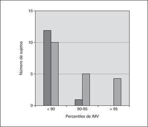 Pacientes y métodos: En un estudio de valores de referencia de la PA ambulatoria en niños y adolescentes que incluye 679 sujetos, 19 (0,03 %), de edad 11,4 ± 2,9 años, fueron diagnosticados de masked hypertension persistente. El criterio diagnóstico fue normotensión por PA clínicas (Pediatrics. 1996;98: 649-58) e hipertensión ambulatoria (Lurbe et al. Am J Hypertens. 2000;13:265) de forma persistente durante un período de 3 años de seguimiento. Trece niños normotensos por PA clínicas y ambulatorias de similar edad, sexo e igual tiempo de seguimiento se incluyeron como controles. Se realizó MAPA (Spacelabs 90217) cada año. En la última MAPA se midió la masa ventricular izquierda (por un único observador que no conocía la cualificación de los niños como casos o controles), se calculó el índice de masa ventricular izquierda (IMV, g/m 2.7) y se expresó en percentiles en función del sexo (blood press monit 1999;4: 165-70).