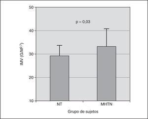 Resultados: Los coeficientes de correlación entre la masa ventricular izquierda con la PA sistólica clínica y ambulatoria fueron 0,24 (p = NS) y 0,45 (p < 0,05), respectivamente. El IMV fue significativamente mayor en los casos que en los controles (34,2 ± 7,2 g/m 2,7 frente a 29,3 ± 4,8 g/m 2,7; p = 0,038). La figura muestra en casos (MHTN) y controles (NT) los valores de IMV (panel a) y la distribución en percentiles (panel b). Los casos estuvieron en percentiles más altos de IMV que los controles. En 10 de los MHTN el IMV estuvo por encima del P90 mientras que sólo estuvo presente en un control.