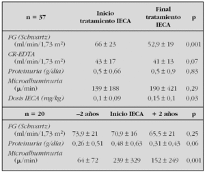 Conclusiones: El análisis del global de pacientes durante el tratamiento con IECA (dosis máxima 0,19 ± 0,12 mg/kg) muestra que la proteinuria y la microalbuminuria han permanecido estables (esta última disminuyó hasta 71 ± 128 mg/min, sin correlacionarse con la dosis máxima de IECA) permaneciendo estable el FG estimado por CR-EDTA (empeoramiento del FG estimado según la talla). En el estudio comparativo de 2 años pre y post-IECA estos logran disminuir la microalbuminuria, manteniendo estable el FG.