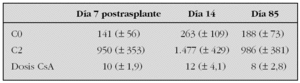 Conclusión: La evolución clínica y las infecciones oportunistas fueron similares a pacientes trasplantados el año anterior controlados con C0 y dosis media de CsA de 5 mg/kg/día. En la serie actual nuestros pacientes pediátricos mostraron mayor dificultad que los pacientes adultos de la literatura médica para obtener las cifras de C2 sugeridas pese a un aumento de la dosis de CsA del 60 %.