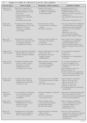 Este estudio revela que el grado de aplicación en la práctica clínica de la evidencia científica disponible sobre manejo del asma en la infancia es insuficiente. Aunque hemos limitado nuestra revisión en el tiempo y a una sola base de datos documental (MEDLINE), los resultados encontrados, si bien no garantizan una visión exhaustiva (necesaria para otros objetivos), sí permiten obtener una imagen suficientemente representativa del problema que nos ocupa. El variado abordaje que los distintos autores han empleado para analizar la práctica clínica impide realizar síntesis cuantitativas, aunque los problemas observados se repiten en distintos estudios.