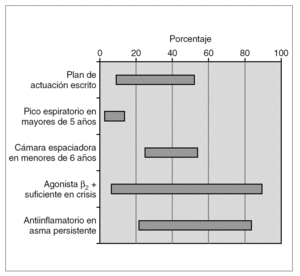 Una encuesta realizada a pediatras de atención primaria en España sobre conocimientos y manejo de los niños asmáticos mostró la existencia de problemas para la catalogación y graduación diagnóstica de estos pacientes, para la realización de medidas de control de la función pulmonar (peak-flow, espirometría), para el correcto adiestramiento de la administración de medicación inhalada y para la elaboración de pautas escritas personalizadas de control del asma36.