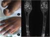 A)Lesiones ulceradas en estadio costroso en el pulpejo y lateral de los dedos de los pies tipo «mordedura de ratón». B)Artritis en articulaciones metacarpofalángicas e interfalángicas proximales de las manos y lesiones en el dorso de los nudillos tipo pápulas de Gottron. C)RM de miembros inferiores, secuencia STIR, plano coronal: lesiones cutáneas en ambos miembros inferiores con morfología pseudonodular y señal patológica brillante que se podrían corresponder con calcinosis.