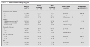 En cuanto a la situación clínica a la llegada a urgencias (tabla 2), el 41 % de los pacientes hipotérmicos evolucionó mal, así como todos los casos con cianosis generalizada, el 57 % de los que presentaban apnea-dificultad grave y todos los pacientes que llegaron en parada cardiorrespiratoria. De los 62 pacientes que llegaron al hospital, uno ingresó cadáver y 21 requirieron soporte hemodinámico y respiratorio agresivo desde su ingreso (34 %). La valoración neurológica determina el pronóstico de forma muy significativa (tabla 3). Al aplicar el sistema Orlowski, los 12 casos con mala evolución tenían tres o más puntos. El pH medio fue de 7,17 para la serie completa, con diferencias respecto a la edad (7,22 en < 4 años y 7,12 en ≥ 4 años) y a la evolución (pH < 7,10 en 11 casos de los que el 64 % evolucionó mal).