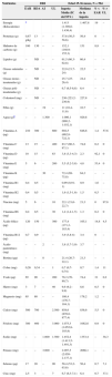 Porcentaje medio de cumplimiento de las DRI (RDA) en la ingesta diaria de nutrientes. Un cumplimiento adecuado de las DRI (RDA/AI) coincide con el 100% del cumplimiento (línea horizontal sobre el 100%). Los valores por debajo de 100 representan consumos de energía o de nutrientes por debajo de los valores recomendados. Los valores por encima de 100 representan consumos de energía o de nutrientes por encima de los valores recomendados.