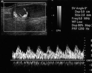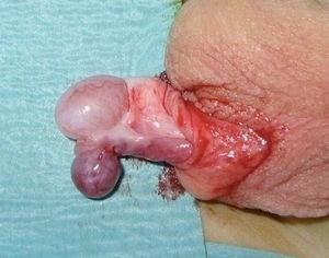 Un niño de 3 años sin antecedentes personales ni familiares de interés presenta una tumoración intraescrotal izquierda, asintomática, detectada por su pediatra en un examen físico rutinario. La exploración física evidencia testículos intraescrotales, de tamaño y consistencia normal, y una tumoración redondeada de 1 cm de diámetro, por encima del testículo izquierdo, bien delimitada, móvil, no dolorosa a la palpación y de consistencia similar al testículo. El resto de la exploración física no detecta hallazgos patológicos. Se realiza una ecografía y una eco-Doppler testicular que muestra una masa intraescrotal izquierda, extratesticular, homogénea redondeada de ecogenicidad y vascularización similar al testículo homolateral, sugestiva de tejido esplénico ectópico (fig. 1). La ecografía abdominal no detecta hallazgos patológicos. El hemograma, la bioquímica y la coagulación son normales. Se indica la realización de intervención quirúrgica para confirmar la sospecha diagnóstica, encontrándose una tumoración extratesticular, encapsulada, unida al polo superior del testículo izquierdo por un pedículo vascular (fig. 2). No se observa cordón o banda de tejido unida a la tumoración que se dirija y penetre a la altura del orificio inguinal externo. No existe persistencia del conducto peritoneo vaginal y el aspecto macroscópico del testículo y epidídimo izquierdo es normal. Se realiza la exéresis de la masa en su totalidad. La recuperación ocurre sin incidencias, y se le da el alta al niño a las 24 h del procedimiento. El estudio anatomopatológico de la tumoración confirma la sospecha diagnóstica de tejido esplénico ectópico; se trata de una fusión esplenogonadal discontinua.