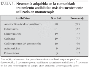 Se instauró tratamiento antibiótico en 298 pacientes (98 %). El 80 % recibieron monoterapia y el resto más de un antibiótico (tabla 3). La duración media de tratamiento del antibiótico de inicio fue de 8,5 ± 2,8 días. De los pacientes que fueron tratados con biterapia, una de las asociaciones más frecuentemente utilizadas fue azitromicina + amoxicilina-ácido clavulánico (9,1 %).