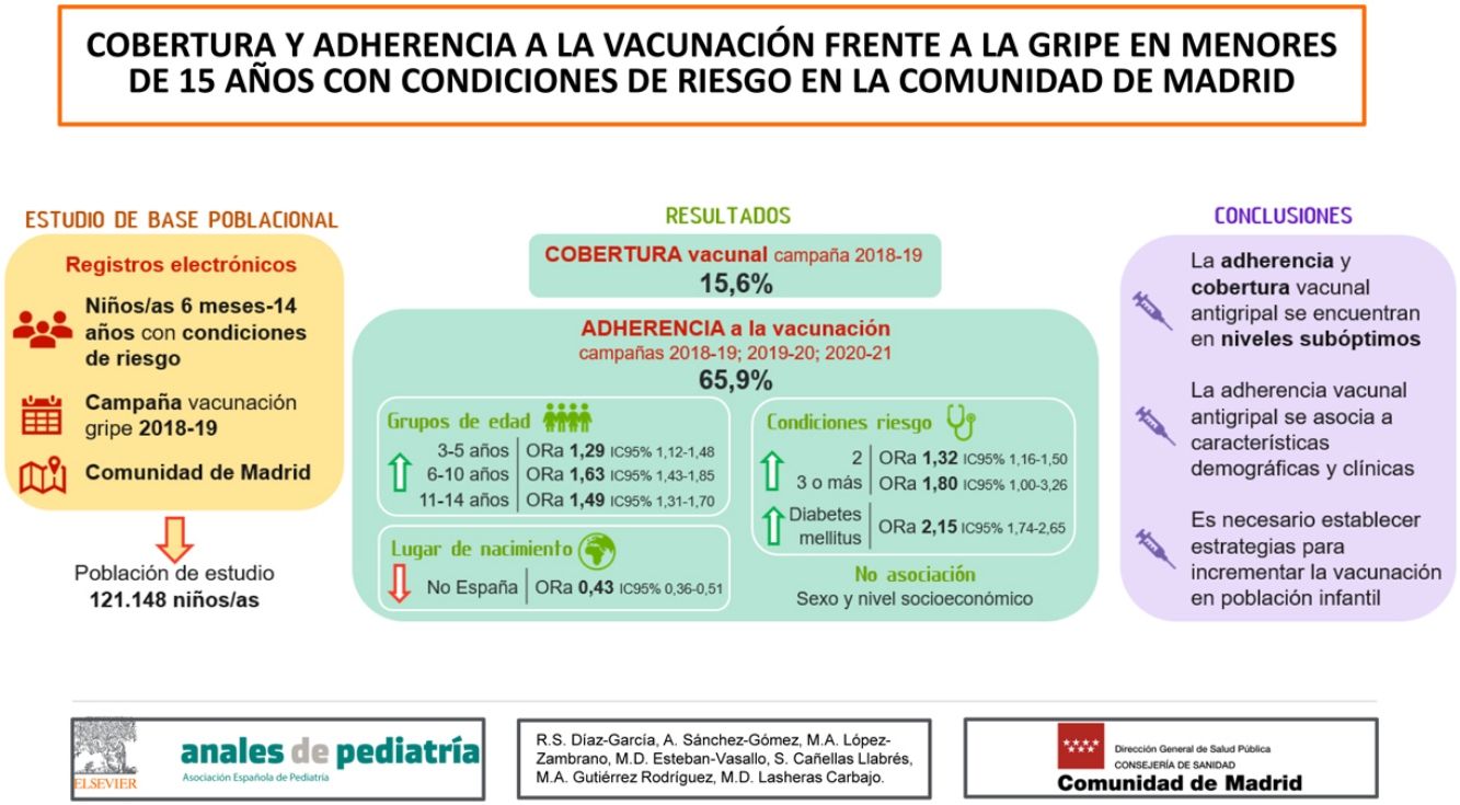 La vacunación antigripal está especialmente indicada en población infantil con riesgo de complicaciones o enfermedad grave. El objetivo de este estudio es describir el porcentaje de vacunación frente a la gripe en menores de 15 años con condiciones de riesgo en la Comunidad de Madrid, así como analizar los factores asociados a la adherencia vacunal a lo largo de tres campañas de vacunación.
