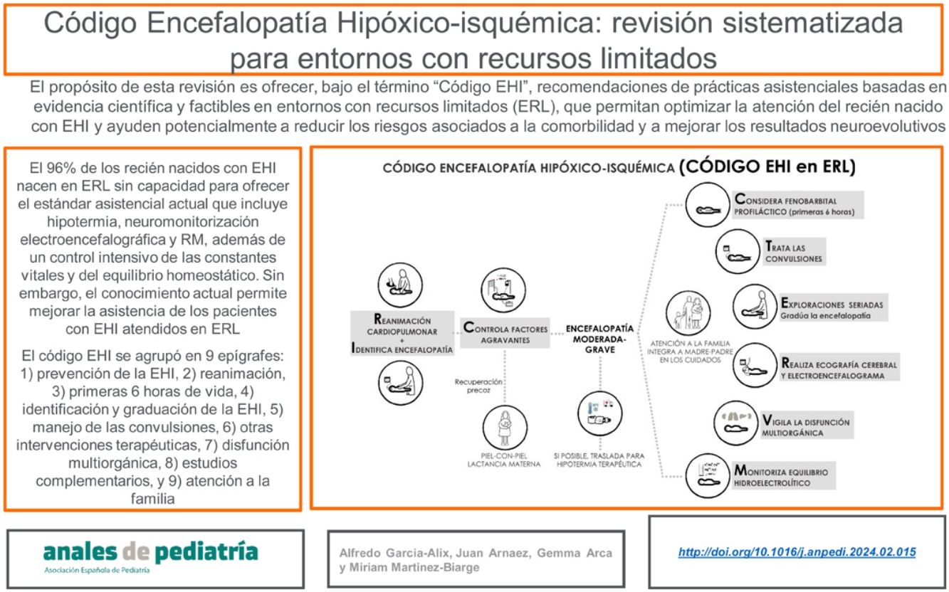 Se estima que el 96% de los recién nacidos (RN) con encefalopatía hipóxico-isquémica (EHI) nacen en entornos con recursos limitados (ERL) sin capacidad para ofrecer el estándar asistencial vigente desde hace cerca de 15 años en los países con altos recursos y que incluye hipotermia terapéutica, neuromonitorización continua electroencefalográfica y resonancia magnética, además de un control intensivo de las constantes vitales y del equilibrio homeostático. Esta situación no parece estar cambiando; sin embargo y aún con estas limitaciones, el conocimiento actualmente disponible permite mejorar la asistencia de los pacientes con EHI atendidos en ERL. El propósito de esta revisión sistematizada es ofrecer, bajo el término «código EHI», recomendaciones de prácticas asistenciales basadas en evidencia científica y factibles en ERL, que permitan optimizar la atención del RN con EHI y ayuden potencialmente a reducir los riesgos asociados a la comorbilidad y a mejorar los resultados neuroevolutivos. El contenido del código EHI se agrupó en nueve epígrafes: 1) prevención de la EHI, 2) reanimación, 3) primeras seis horas de vida, 4) identificación y graduación de la EHI, 5) manejo de las convulsiones, 6) otras intervenciones terapéuticas, 7) disfunción multiorgánica, 8) estudios complementarios, y 9) atención a la familia.