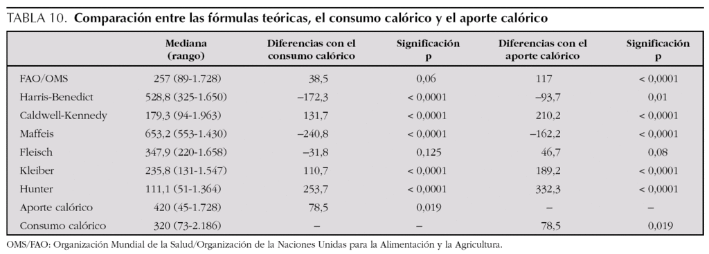 Existió una correlación estadísticamente significativa entre el consumo y el aporte calórico (tablas 8 y 9). El aporte calórico fue significativamente superior al consumo (tabla 10), excepto en 11 estudios en que ocurrió lo contrario: cuatro eran niños que recibían sólo fluidoterapia intravenosa, otros cuatro eran estudios en un mismo paciente con trasplante de médula ósea que estaba alimentado con nutrición parenteral y los otros 3 niños recibían nutrición enteral, uno de ellos en el primer día de nutrición sin haber alcanzado el máximo aporte calórico.