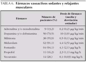 En 50 estudios (73,5 %) los pacientes recibían fármacos vasoactivos, en 66 (97 %) fármacos sedantes y en 14 (20,5 %) relajantes musculares. La tabla 6 recoge el porcentaje de pacientes y el tipo y la dosis de fármacos recibida. Los niños que recibieron una dosis de fármacos inotrópicos más baja (índice de inotrópicos < 10) presentaron un consumo calórico significativamente mayor que los niños con una dosis de inotrópicos superior. Sin embargo, el aporte calórico recibido entre ambos grupos fue similar (tabla 7). Tampoco existió correlación entre la dosis de adrenalina y/o noradrenalina y el consumo calórico.