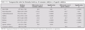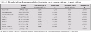 En nuestros pacientes, coincidiendo con que lo referido por Vázquez et al17, existió una buena correlación global entre el consumo calórico con la mayoría de las fórmulas teóricas. Sin embargo, existieron diferencias significativas entre el consumo calórico y las necesidades calóricas calculadas por casi todas las fórmulas, infraestimando éstas en la mayoría de los casos el consumo calórico real. En un importante porcentaje de las ocasiones las diferencias eran mayores de un 20 %. La gran variabilidad interindividual en el consumo calórico podría justificar en parte la mala concordancia encontrada en la mayoría de los estudios entre el consumo calórico real y las fórmulas teóricas que se basan casi exclusivamente en el peso y talla, y que además en algunos casos no han sido valoradas para niños5,9,13-17,19,20. Esto supone un importante problema, ya que el aporte calórico guiado por fórmulas teóricas es con frecuencia inadecuado, produciendo casi siempre subnutrición y en ocasiones sobrenutrición. Por otra parte, la utilización de calorimetría indirecta está reservada en el momento actual para ensayos clínicos en determinadas unidades.