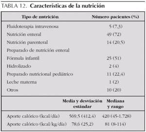 En el momento del estudio, 5 pacientes (7,3 %), en las primeras 24 h de ingreso, estaban a dieta absoluta con fluidoterapia intravenosa, 14 (20,5 %) recibían nutrición parenteral y en 49 (72 %) nutrición enteral transpilórica (tabla 12). Los niños que recibieron solamente fluidoterapia presentaron menor consumo calórico que los alimentados con nutrición enteral o parenteral. Los pacientes a dieta recibieron un aporte calórico significativamente inferior al consumo, mientras que los niños tratados con nutrición enteral y parenteral recibieron un aporte calórico significativamente superior al consumo (tabla 13). No existieron diferencias en el consumo ni aporte calórico entre los pacientes tratados con fórmula adaptada (lactantes) y los que recibieron fórmulas nutricionales líquidas (niños mayores). Sin embargo, los que recibieron nutrición con fórmula adaptada presentaron una mayor producción de CO2 y un CR superior.