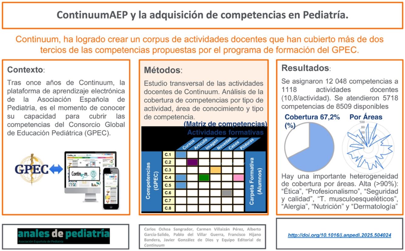 According to the Global Pediatric Education Consortium (GPEC), paediatricians need to acquire and maintain a set of competencies in their daily practice. Continuum, the online training platform of the Spanish Association of Pediatrics, has developed training activities to explore and achieve these competencies.