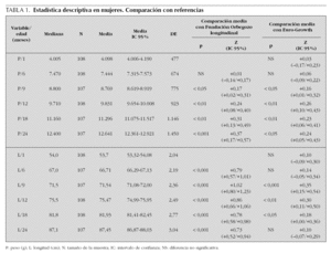 Centrándonos en los resultados, el peso medio de nuestras mujeres fue superior que el de las dos referencias utilizadas entre los 9 y 24 meses, aunque con respecto a las europeas la diferencia a los 2 años es escasa. La diferencia es más llamativa en longitud. Nuestras niñas miden de promedio significativamente mucho más que la media española de referencia entre los 6 y 24 meses (p < 0,001), mostrando sólo pequeñas diferencias con la media europea, no significativa, a la edad de 2 años (tabla 1).
