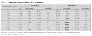 En la tabla 3 se muestra el porcentaje de niños de nuestro estudio que se sitúan por debajo del percentil 3 (P3) o por encima del P97 de las gráficas longitudinales españolas. Dicho porcentaje es claramente inferior al 3 % en todos los parámetros en ambos sexos, en el caso del P3. Por el contrario, especialmente en longitud, un importante porcentaje de niños sanos sobrepasan el P97 para su edad entre los 6 y 24 meses, de hasta el 17,75 % a los 2 años en las mujeres, y el 8,47 % en los varones.