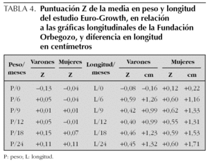 El estudio longitudinal Euro-Growth9 incluye sólo niños de 0 a 3 años nacidos entre 1990-1993, el 25 % de los cuales son españoles, lo que podría permitir también su aplicación en nuestro país. Nuestros hallazgos actuales sólo mostraron pequeñas diferencias con el mismo, no significativas en el caso de la longitud a los 2 años de edad en ambos sexos. En el estudio Euro-Growth se observa un peso medio que no difiere en los primeros 2 años de las gráficas longitudinales de la Fundación Orbegozo. Sin embargo, en longitud existen evidentes diferencias y, así, sus varones miden 1 cm más de promedio, y sus mujeres 1,3 cm más a los 12 meses, y 1,3 y 1,7 cm, respectivamente, a los 2 años (tabla 4).