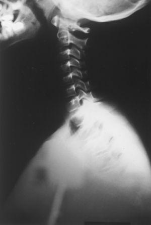 Figura 1. Radiología de columna cervical: se aprecian apéndices costales de predominio en C6.