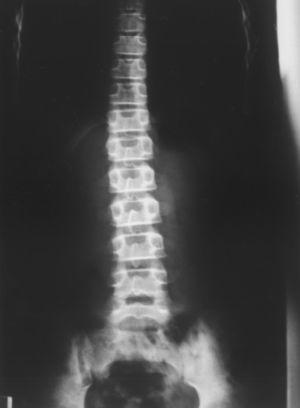 Radiografía simple de columna (en bipedestación y descalza). Ligera escoliosis lateral dorsolumbar de convexidad derecha.