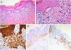Infiltrado linfocítico en banda en dermis papilar, cambios vacuolares de la capa basal (elipses) y queratinocitos apoptósicos (flechas) en la punta de las crestas epidérmicas (hematoxilina-eosina [A] x20 y [B] x40; inmunohistoquímica para citoqueratina AE1/AE3 [C]). Inmunohistoquímica para CD4+ (D) y CD8+ (E).