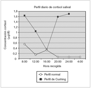 Figura 1.Ritmo circadiano de cortisol salival en paciente con síndrome Cushing frente a ritmo en población normal.