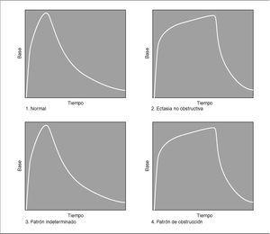 A todos los pacientes se les determinaron los niveles de creatinina y electrólitos en sangre a partir del tercer-cuarto día posnatal. Se realizó un estudio ecográfico en la primera semana y al mes de vida en el que se valoró la medición del diámetro anteroposterior de la pelvis renal en milímetros y, además, las HN se clasificaron según el sistema de graduación de la Sociedad de Urología Fetal11,12 en 4 grados en función de si existía o no dilatación de los cálices y adelgazamiento del parénquima renal asociados a la dilatación de la pelvis (tabla 1). Se les realizó una uretrocistografía miccional seriada para descartar reflujo vesicoureteral y un RID al mes de vida. Para la realización del RID a los pacientes se les hidrató por vía oral y se les posicionó en decúbito supino inmovilizados mediante una manta de vacío; en ningún caso se efectuó sondaje vesical. El radiotrazador empleado fue la mercaptoacetiltriglicina-99mTc (99mTc-MAG-3), administrándose una dosis intravenosa en embolada de 1,85 MBq (50 μCi) por kilo de peso, con una dosis mínima de 37 MBq (1 mCi). El diurético empleado fue la furosemida intravenosa administrándose 1 mg/kg de peso al inicio del estudio. El método empleado para el cálculo de la función renal relativa (FRR) fue el de la integral durante los minutos 1 y 2 del estudio. El RID se interpretó según parámetros cuantitativos y cualitativos; la FRR del riñón hidronefrótico se clasificó en: "normal" cuando el riñón contribuía entre un 45 y un 54 % en la función renal total, "disminuida" cuando aportaba entre un 40 y un 44 %, "disminuida significativamente" cuando su porcentaje de FRR se encontraba por debajo del 40 % y "supranormal" cuando era superior o igual al 55 %; en la interpretación cualitativa de la curva del RID se diferenciaron 4 patrones de drenaje del radiotrazador descritos por O'Reilly et al13-15 (fig. 1): "Normal" cuando se visualizaba una eliminación rápida y completa del radiotrazador, "ectasia no obstructiva" ante un retraso en el drenaje del radiotrazador al inicio seguido de una eliminación rápida y completa del mismo en el momento de máximo efecto del diurético, patrón "indeterminado" cuando existía una respuesta parcial al estímulo diurético y patrón "sugerente de obstrucción" ante una curva progresivamente ascendente.