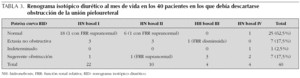El RID al mes de vida en los 40 pacientes restantes, en los que debía descartarse estenosis de la unión pieloureteral, en 36 mostró una FRR "normal", en uno se encontraba "disminuida", en ninguno "significativamente disminuida" y en tres fue "supranormal". En cuanto a la curva de eliminación del radiotrazador en estos 40 pacientes, en 25 fue "normal" (uno con HN basal ecográfica grado IV), en siete mostró un patrón de "ectasia no obstructiva", en uno patrón "indeterminado" y en siete patrón "sugerente de obstrucción" (uno de ellos con HN basal grado I y otro con HN basal grado II y FRR supranormal) (tabla 3).
