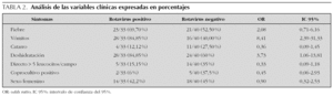 Los signos y síntomas clínicos que se asociaron significativamente a la infección fueron los vómitos (OR: 8,40; IC 95 %: 2,39-31,33), y la deshidratación (OR: 3,73; IC 95 %: 1,06-13,81).