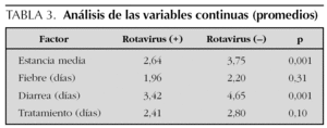 La descripción general de los grupos de casos rotavirus positivo y controles rotavirus negativo puede observarse en la tabla 1, de donde se observa que no existieron diferencias significativas en las variables de base en ambos grupos.