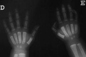 Figura 2. Radiografía de ambas manos con aumento de partes blandas y refuerzo perióstico en primer metacarpiano de ambas manos.