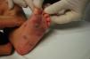Lactante varón de 10 meses de edad, con cuadro previo de vómitos y diarrea, que presenta tras su resolución lesiones maculopapulosas purpúricas confluyentes de predominio en zonas acras. Dichas lesiones son más llamativas en las extremidades inferiores, afectando a palmas, plantas y pabellón auricular izquierdo. Se asocia edema de manos y pies, con leve tumefacción malar. En todo momento presenta excelente estado general, permaneciendo afebril y con resolución del cuadro en 6 días.