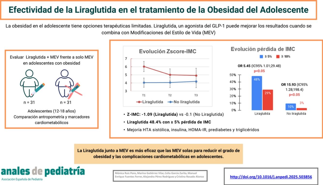 La obesidad en adolescentes tiene opciones terapéuticas limitadas y los resultados con las modificaciones de estilos de vida (MEV) son escasos. Liraglutida, un agonista del receptor GLP-1, fue el primer fármaco aprobado en España para el manejo de la obesidad en ≥12 años.
