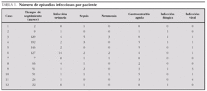 Las complicaciones más frecuentes fueron las infecciosas. El 100 % de los pacientes presentó alguna infección bacteriana. Las más frecuente fueron infección urinaria, que presentó el 75 % de los pacientes, sepsis (75 %), gastroenteritis aguda (66,7 %) y neumonía (33,5 %). Hubo un total de 75 infecciones bacterianas invasivas, con una mediana de 7,5 infecciones por paciente (rango IQ: de 1,25-10,25) (tabla 1).
