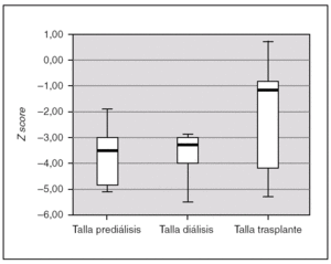 Todos los pacientes presentaron retraso de crecimiento en algún momento de su evolución. Si analizamos el crecimiento de los 7 pacientes que completaron las 3 fases de tratamiento, comprobamos que tras el trasplante se produce un incremento de talla estadísticamente significativo (p = 0,028). La talla durante la prediálisis, expresado en Z score, fue de 3,54 (4,86-2,79), durante la diálisis de 3,28 (4,01-2,91), y tras el trasplante se alcanza una talla de 1,34 (4,45-0,72) (fig. 3). En ningún paciente se empleó hormona de crecimiento.
