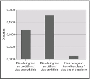 Figura 5. Proporción de días de ingreso/días libres de ingreso en las fases de prediálisis, diálisis y trasplante renal.