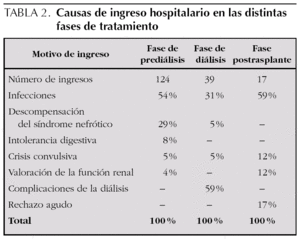 Durante el período de prediálisis, los niños estuvieron ingresados una mediana de un día de cada 8,5. Esta proporción aumenta durante la diálisis hasta un día de cada 5,5, debido a las complicaciones que supone esta técnica. En el período de trasplante la necesidad de ingreso se reduce hasta un día de cada 87 (fig. 5). Las causas de ingreso en cada período quedan expuestas en la tabla 2.