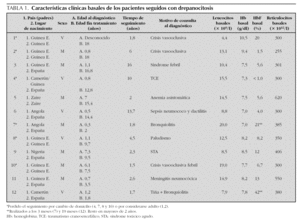 Se estudiaron 23 episodios de STA aparecidos en 8 pacientes de los 12 seguidos en nuestro centro con esta enfermedad (4 varones y 4 mujeres). La mediana de edad fue de 4 años (rango, 1-17 años); 10 episodios eran en menores de 3 años y 13 en mayores de 3 años. El tiempo de ingreso por STA representó el 35,6 % del total de días de ingreso del conjunto de pacientes seguidos por drepanocitosis en nuestro centro, siendo la segunda causa de ingreso junto con las crisis vasooclusivas (24 episodios), por detrás de los 42 ingresos por infecciones (tabla 2). Dos pacientes presentaron múltiples episodios de STA (cinco y nueve, respectivamente). En uno de ellos, dos de los episodios se desencadenaron pocos días después de iniciarse el tratamiento con hierro; en el primero coexistía una parasitación por Plasmodium falciparum9 y el segundo produjo el cuadro más grave visto en nuestro centro atribuido a embolia grasa. No hubo correlación de los niveles de hemoglobina F con el número de episodios de STA.
