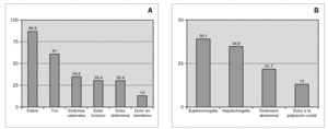 Figura 2. Porcentaje de aparición de síntomas(A)y signos(B)al ingreso.