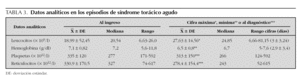 En cuanto al tratamiento, todos los pacientes recibieron antibioticoterapia de amplio espectro (cefalosporina de tercera generación) en la mayoría asociado a un macrólido y oxigenoterapia. Se anotó la necesidad o no de administración de analgesia (antiinflamatorios no esteroideos [AINE], narcóticos) y de transfusión sanguínea (transfusión simple o exanguinotransfusión parcial [ETP]) y el día de administración y, por último, el empleo o no de corticoides (dexametasona).
