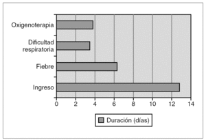 Al comparar los datos de la evolución por grupos de edad se observó mayor duración de la dificultad respiratoria en los de mayor edad (mediana en < 3 años, 1 día; > 3 años, 4 días; p = 0,006). Los niños de mayor edad tuvieron tendencia a presentar fiebre de más duración (mediana en < 3 años, 4,5 días; > 3 años, 8 días; p = 0,07).