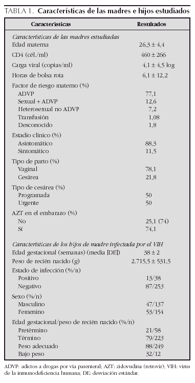Se han identificado 290 madres y 291 niños, 137 niños y 154 niñas. Un embarazo fue gemelar. En la tabla 1 se reflejan las características de las madres y niños. La edad media de las madres fue 26 ± 4 años. La conducta de riesgo materno para la adquisición de la infección por el VIH fue la adicción a drogas por vía parenteral (ADVP) en 213 casos. El 51 % consumieron durante el embarazo. El contagio por vía heterosexual se produjo en 20 casos, en tres por transfusión de hemoderivados y en cinco se desconoce. Estaban asintomáticas en el momento del parto 214 madres. Inmunológicamente el 47 % de las 136 madres en las que se determinó el número de CD4 tenía más de 500 cél./μl, mediana 396 células x 106/l (rango, 3-1.265). El número medio de CD4 fue 483 ± 284 células x 106/l en las madres que no recibieron tratamiento durante el embarazo y 498 ± 250 células x 106/l en las tratadas. La carga viral se realizó en 101 mujeres, con una mediana de 3,5 log, r(1,6-5,5). Tampoco existen diferencias significativas en la carga viral en estos dos grupos, si bien sólo se dispone de carga viral en 49 de las madres no tratadas (20 %).