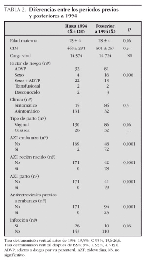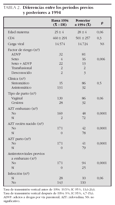 Al estudiar de forma comparativa períodos previos y posteriores a 1994, se observa un aumento en la edad materna, en el número de recién nacidos pretérmino, así como una reducción del tiempo de bolsa rota y una tendencia a realizar más partos por cesárea, sobre todo programadas. Además, se generaliza la aplicación del protocolo ACTG 076 y del tratamiento antirretroviral durante el embarazo, disminuye en consecuencia la tasa de transmisión vertical.