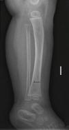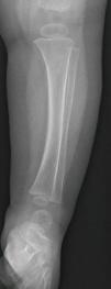 Niño de 12 meses, sin antecedentes de interés, que consulta por limitación para la deambulación de 24h de evolución, sin otra sintomatología acompañante. No historia de traumatismo ni cuadro catarral previo. En la exploración no se objetiva aumento de volumen articular, ni puntos dolorosos. Mantiene posición en reposo en flexo de cadera y rodillas, pero rechaza el apoyo de pie izquierdo en bipedestación. El resto de la exploración física es normal. Se realiza radiografía de tibia-peroné izquierda que muestra una fina línea de fractura en tibia distal solo en proyección lateral (figs. 1 y 2).