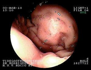 La lesión de Dieulafoy es una causa rara de hemorragia digestiva, que aparece generalmente en pacientes varones de edad media o avanzada. Desde el punto de vista histológico refleja la existencia de una inusual y gruesa arteria que atraviesa la submucosa y discurre en contacto con la mucosa. Mínimas roturas de esta capa hacen posible la rotura del vaso. Por regla general asienta en el estómago proximal, localizándose el 80 % de ellas en la zona de la curvatura menor 1-3. Su diagnóstico inicial es endoscópico y requiere la visualización de un punto sangrante arterial a través de un defecto menor de 3 mm de la mucosa, un vaso que protruye (hemorrágico o no) dentro de un defecto mucoso pequeño con una mucosa aparentemente normal alrededor o un coágulo de base estrecha adherido a un mínimo defecto de la mucosa. Si se identifica correctamente la lesión desde un principio, la aplicación de tratamiento endoscópico suele conducir a una evolución favorable 4.